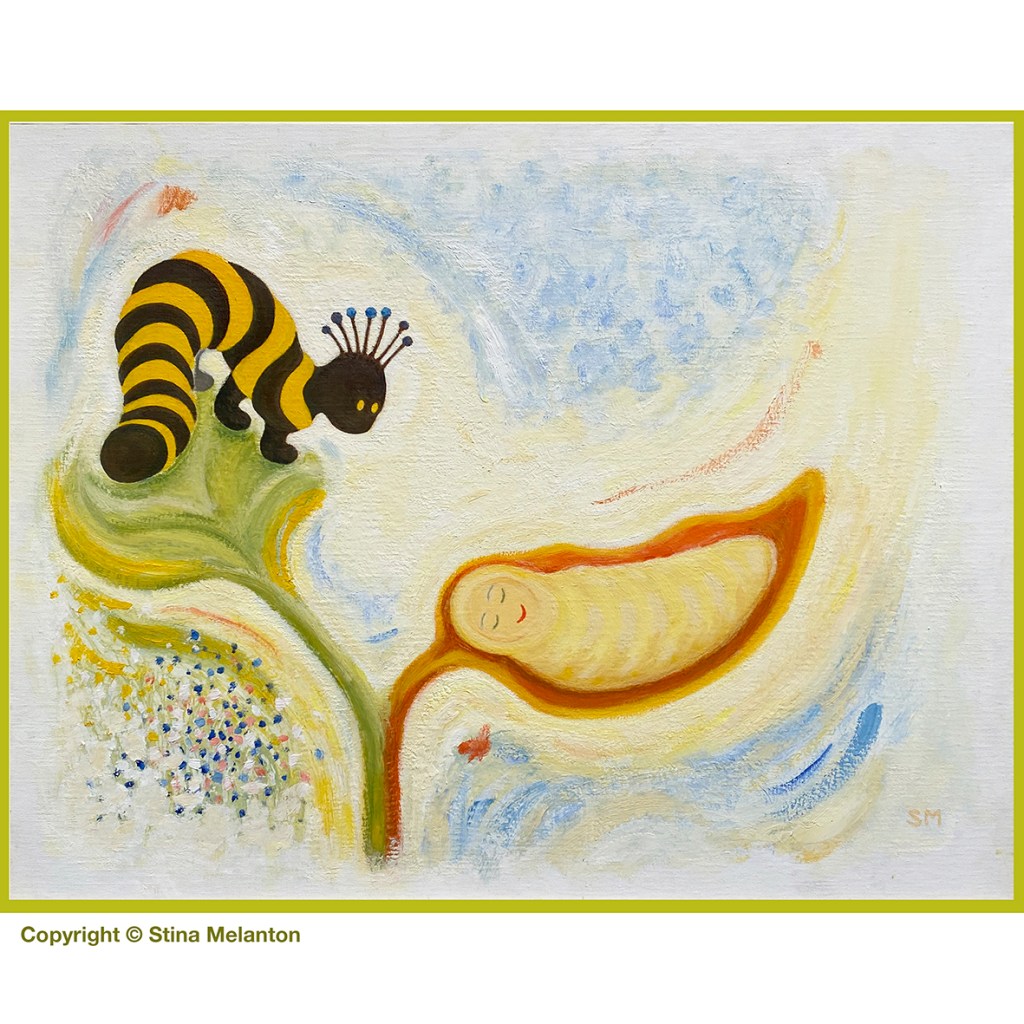 The Larva and the butterfly Puppa, Change – oil on canvas.
